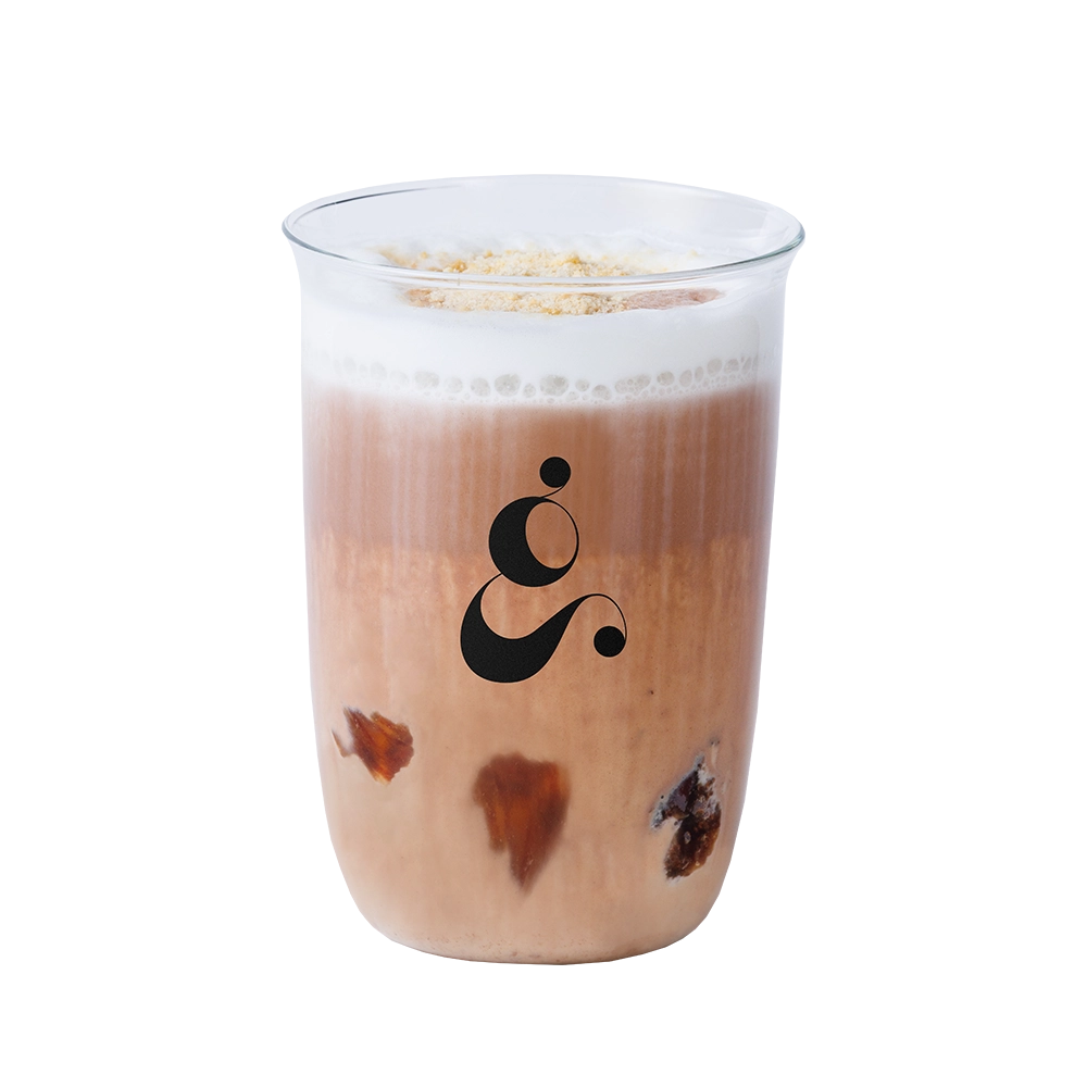 Latte with dates, topped with salted caramel and chocolate ice cream, cookie crunches.